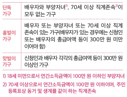 신청하는 연도의 직전 연도 부부합산 총소득이 가구 유형별 기준금액 미만이어야 합니다.