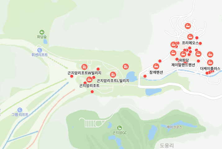화담숲 생태수목원 아래쪽에 곤지암 리조트가 있으며, 이곳 주변에 숙박시설이 많으므로 네이버에서 검색해보시면 더 다양한 곳을 볼 수 있습니다.