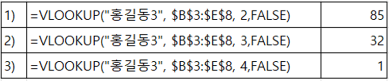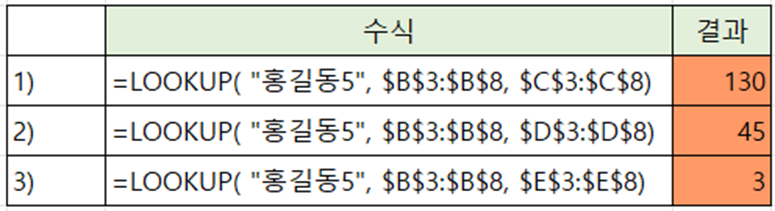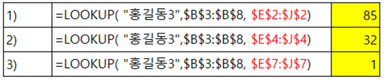 위 사례의 LOOKUP 1) 2) 3) 을 VLOOKUP()으로 표현하면 아래와 같습니다.