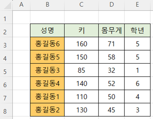 아래에서 "성명" 열의 값들이 정렬되어 있지 않다고 합시다.
