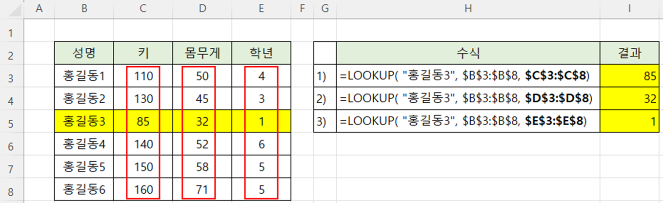 "홍길동5"를 lookup_value로 해서 키, 몸무게, 학년의 값을 가져오는 수식을 LOOKUP 함수로 만들면,