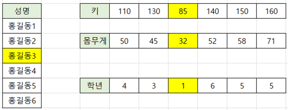 "키" vector, "몸무게"vector, "학년" vector에서 같은 index를 가진 값들만 가져올 수 있습니다.