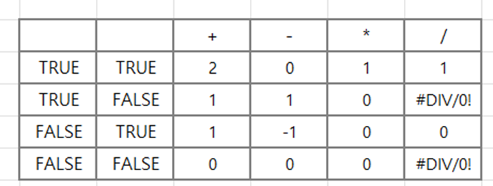 아래는, TRUE와 FALSE에 사칙연산( +, -, *, /)을 실행한 결과를 보여줍니다.