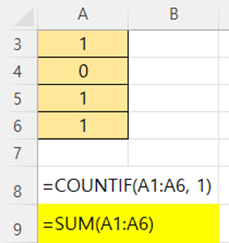 COUNTIF(A1:A6, 1) 보다는 SUM(A1:A6) 이 훨씬 간단하고 쉽습니다.