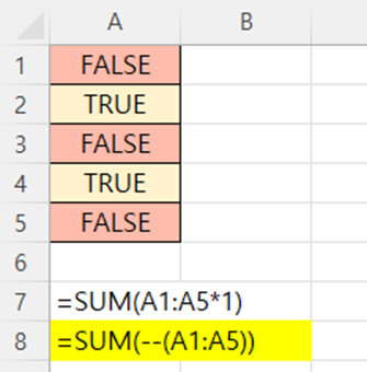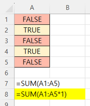 SUM(A1:AS5) 라고 하면, 0 이 나옵니다. TRUE/FALSE는 sum 할 수 없기 때문입니다.