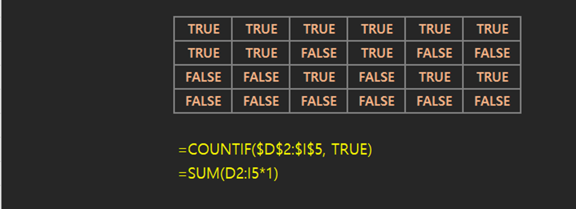 그런데, SUM 함수만으로는 TRUE와 FALSE를 더할 수 없습니다.