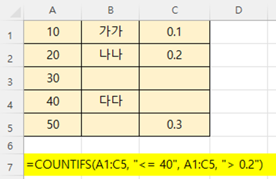 40 이하 이고, 0.2 보다 큰 숫자의 갯수를 세고 싶다면, 조건이 2개이므로 COUNTIFS()를 이용하면 됩니다.