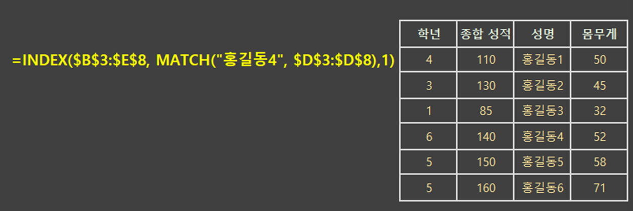 INDEX($B$3:$E$8, MATCH("홍길동4", $D$3:$D$8),1)
