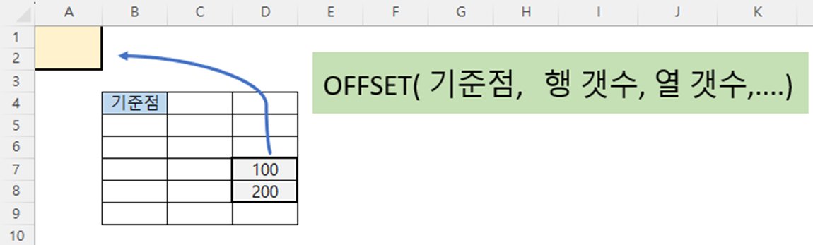 OFFSET 함수는 "기준점"에서 몇 행, 몇 열 떨어져 있는 영역의 값(들)을 참조하는 함수입니다.