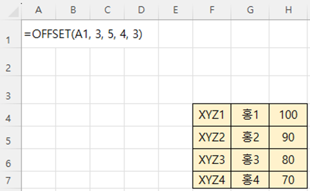 아래 예에서, OFFSET(A1, 3, 5, 4, 3) 이라고 하면,