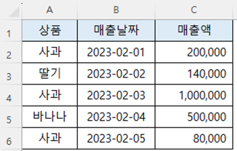 "2023-2-3" 포함하여 이전에 판매한 상품 중에 "사과"의 매출액을 합하고 싶다면,