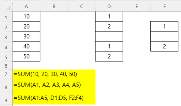 SUM(A1:A5, D1:D5, F2:F4)