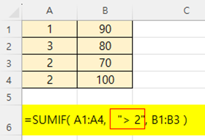조건: A열 값이 2보다 크거나 같은 행의 B열 값을 더하라.