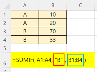 A1~A4 범위에서 값이 "B"인 행의 B열에 있는 값들을 더하는 예제입니다.