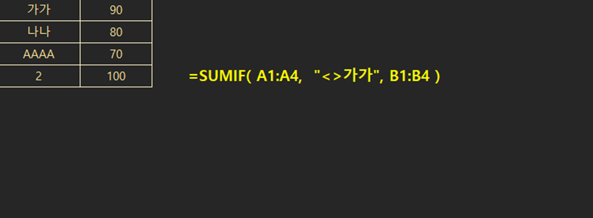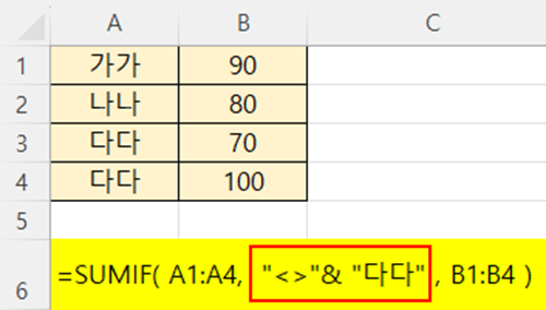 아래 예에서, A열 값이 "다다"가 아닌 행의 B열 값을 더하고자 한다면,