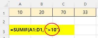 A1~D1 셀에 아래와 같이 숫자가 있을 때, 10보다 큰 값들을 더하고 싶다면,