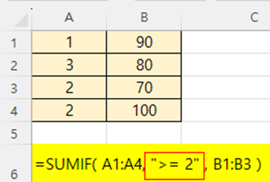 조건:  A열 값이 2보다 크거나 같은 행의 B열 값을 더하라.