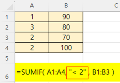 조건: A열 값이 2보다 작은 행의 B열 값을 더하라.