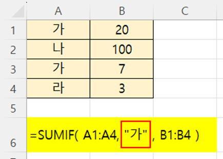 조건 : A열에서 셀값이 "가" 인 행의 B열 값을 합하라.