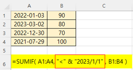 조건: A열에서 "2023-01-03" 이전인 행의 B열 값만 더하라