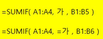 A1:A4 는 조건식을 적용하는 범위이고, B1:B4는 합계할 숫자가 입력된 범위입니다.