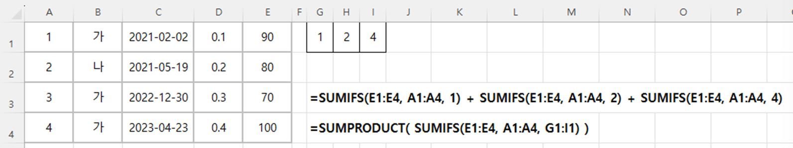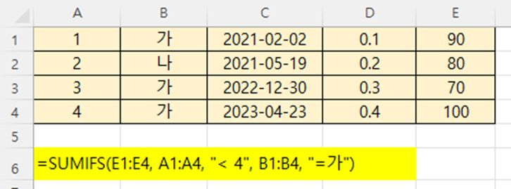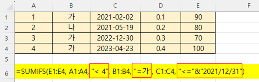 SUMIFS(E1:E4, A1:A4, "< 4", B1:B4, "=가", C1:C4, "<="&"2021/12/31")