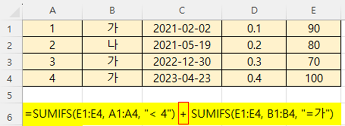 SUMIFS(E1:E4, A1:A4, "< 4") + SUMIFS(E1:E4, B1:B4, "=가")