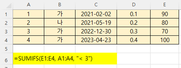 SUMIF()를 사용한다면 SUMIF(A1:A4, "< 3", E1:E4) 와 같이, 합계범위(E1:E4)가 뒤로 옵니다.